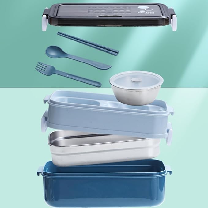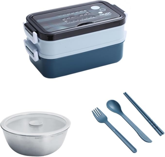 Generic - طقم حافظة غداء مكونة من ثلاث طبقات مع أدوات مائدة ووعاء من الفولاذ المقاوم للصدأ، لون أزرق ورمادي