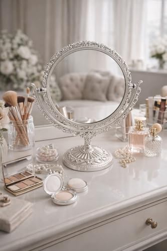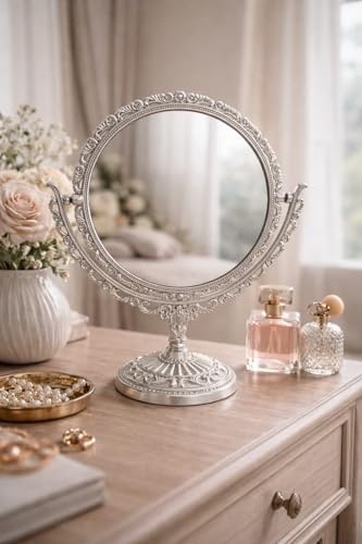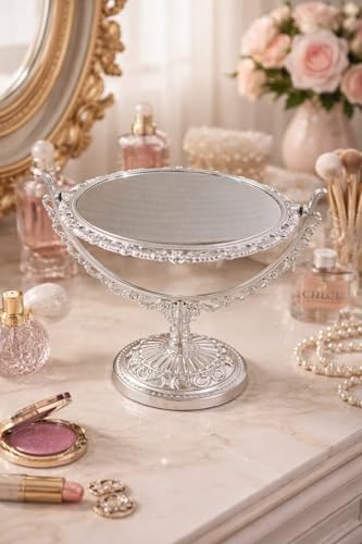Generic - مرآة مكياج 2 في 1 بوجه عادي ووجه مكبر – مرآة تجميل مزدوجة الاستخدام بتصميم ديكور أنيق – مرآة طاولة عملية للاستخدام اليومي – مستوردة لون فضى (موديل 1 دائرى)