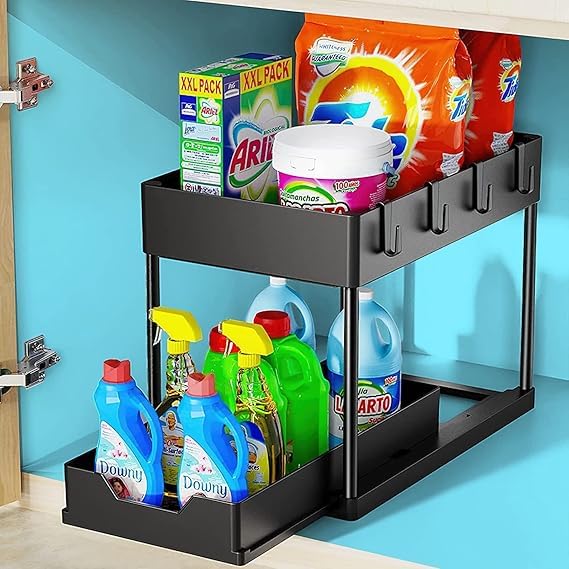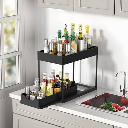 - تخلص من الفوضى على الفور، هل سئمت من التوابل والزجاجات والبرطمانات الصغيرة التي تغزو الطاولات؟ يمنح المنظم الذكي المكون من رفين كل شيء مكانًا مناسبًا ويوفر مساحة على الفور، لا مزيد من ضغوط الفوضى اليومية.