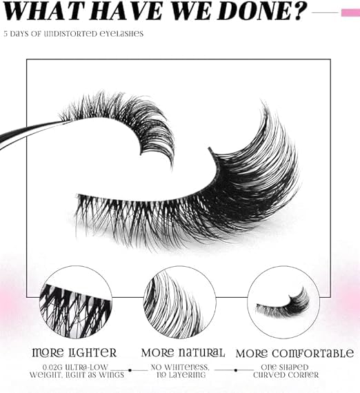 - تشعرين وكأنك لا ترتدي شيئًا: صُممت هذه الرموش للارتداء طوال اليوم، وهي مصنوعة من ألياف صناعية فائقة النعومة وذات ملمس خفيف على الأغطية. يضمن شريط الرموش المرن والرقيق ملاءمة آمنة ومريحة، مما يجعل الاستخدام سريعًا وصديقًا للمبتدئين. لا تخز أو ثقل - فقط لمسة نهائية سلسة وغير مرئية تبدو وكأنها رموشك الخاصة.
