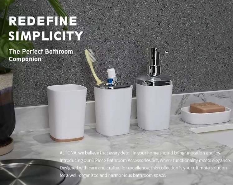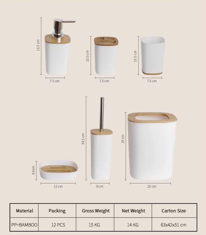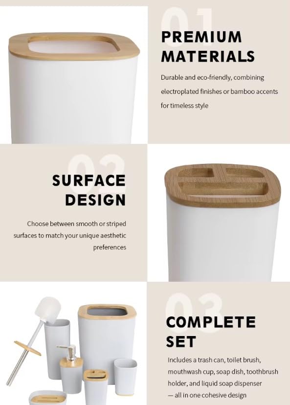 - مجموعة كاملة من 6 قطع: تتضمن المجموعة موزع لوشن وكوب وحامل فرش أسنان وصبانة وحامل فرشاة مرحاض وسلة نفايات.