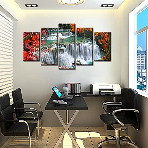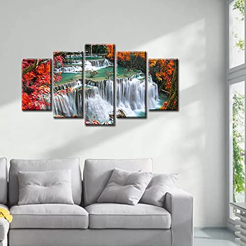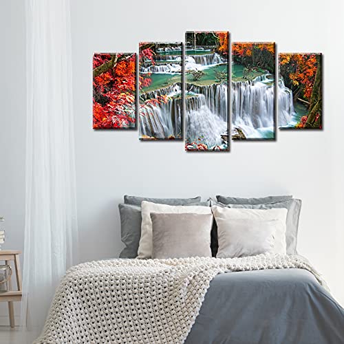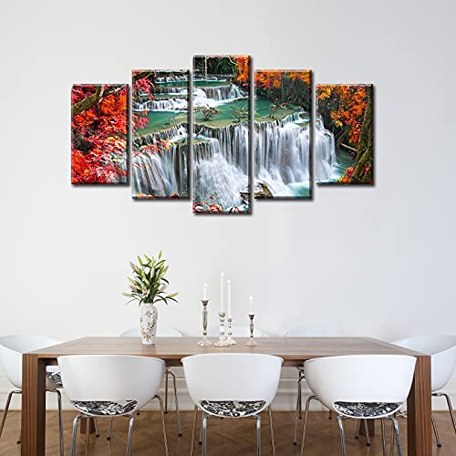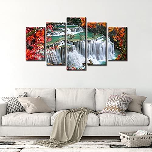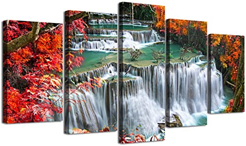 DJSYLIFE - لوحة فنية جدارية لغرفة النوم بلون احمر لديكور الحائط من خشب القيقب، صور شلال الخريف والغابات، مطبوعة على القماش مقاس 40 انش عرض × 22 انش ارتفاع، 5 قطع