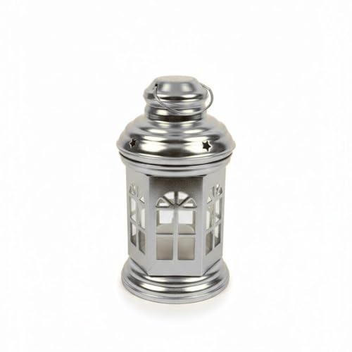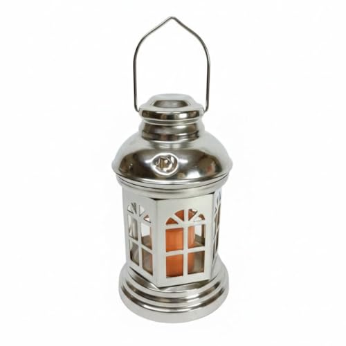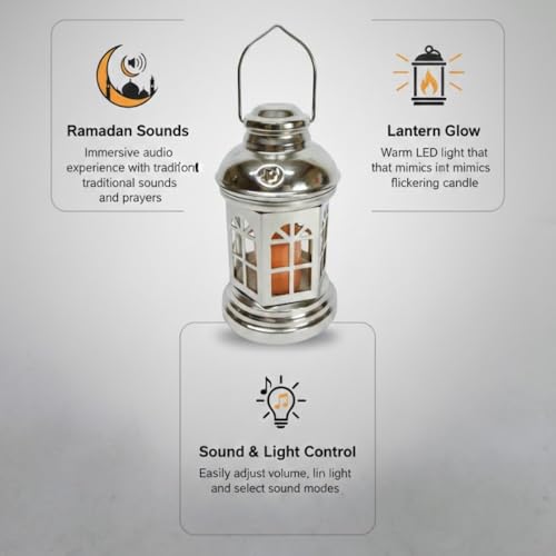 Generic - فانوس رمضان معدني فضي كلاسيكي مع إضاءة LED وتأثيرات صوتية تراثية، تصميم نوافذ هندسية عتيقة، ديكور رمضاني للمنزل والمكتب