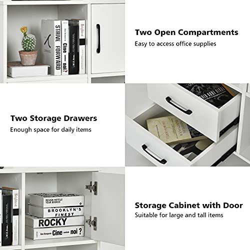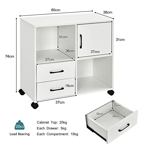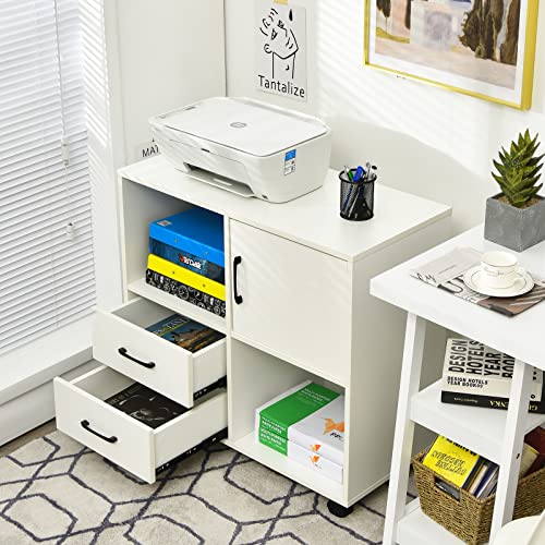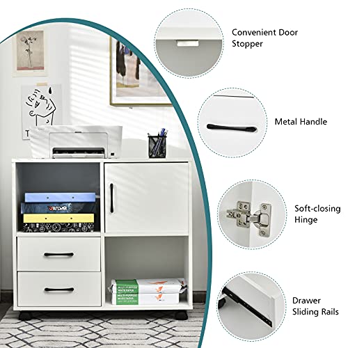 COSTWAY - كوستواي خزانة ملفات متنقلة تخزين قرطاسية جانبية مع درجين 2 رف مفتوح وباب حامل طابعة دوار للمنزل والمكتب وحدة تنظيم المستندات ابيض معدن خشبي هندسي