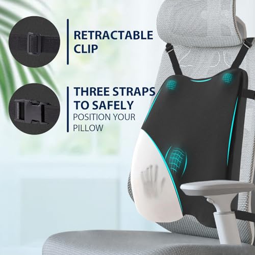 CUISIBOT - مخدة دعم أسفل الظهر لكرسي المكتب - ومخدة قطنية من الفوم ميموري، دعم الظهر لكرسي المكتب والسيارة ودعم آلام أسفل الظهر، تحسن من استقامة الظهر، 3 أحزمة قابلة للتعديل من كويسيبوت، أسود