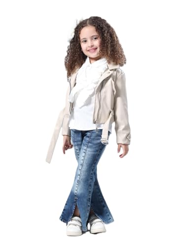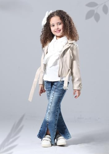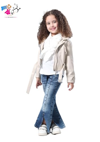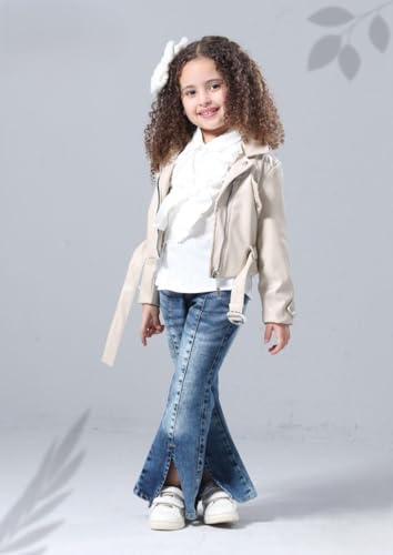 Generic - طقم بناتي 3 قطع موضتي – جاكيت جلد بني + بلوزة بيضاء + بنطلون جينز فلير – ملابس خروج بنات من 2 إلى 5 سنوات