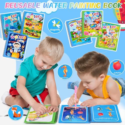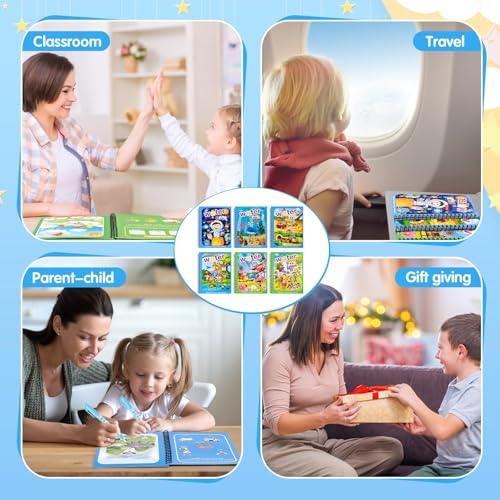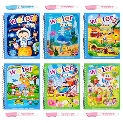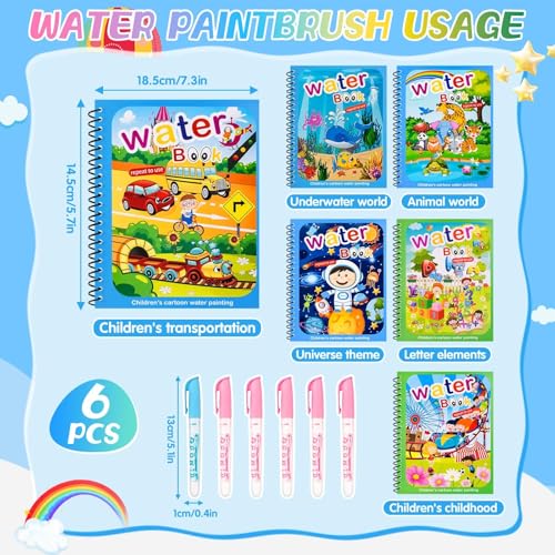 GLURIZ - جلوريز 6 كتب رسم مائية سحرية قابلة لاعادة الاستخدام، كتب رسم مائية قابلة لاعادة الاستخدام، الوان مائية قابلة لاعادة الاستخدام للاطفال مع 6 اقلام رسم