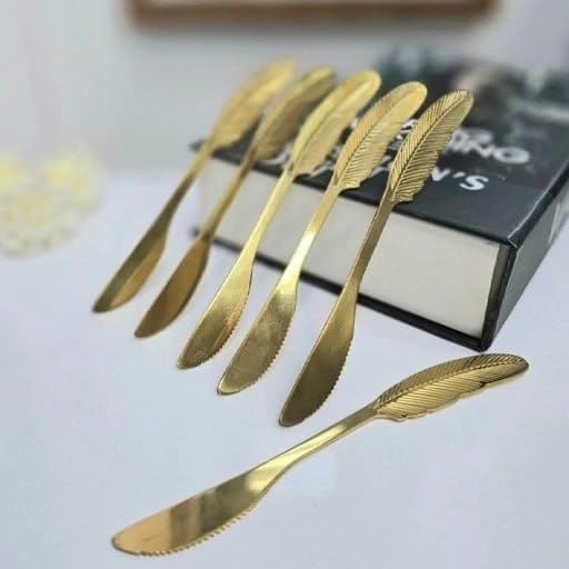 Generic - طقم سكاكين حلويات ذهبي ستانلس ستيل 6 قطع تصميم ريشة فاخر لتقطيع الكيك والتورتة والجاتوه أدوات تقديم أنيقة للمناسبات