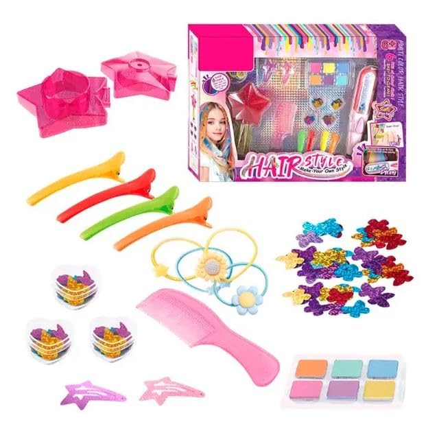 - مجموعة تصفيف شعر متكاملة: تتضمن مشابك شعر ملونة، أربطة شعر، مشط، وإكسسوارات متنوعة لتصفيف الشعر بطرق مختلفة ومبتكرة