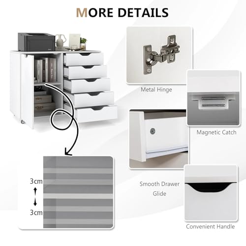 KOMFOTTEU - خزانة ملفات مع 5 ادراج من كومفوتتو، صندوق تخزين متنقل مع خزانة باب، وحدة تخزين مكتبية، 5 عجلات عالمية، 79 × 39 × 65 سم، ابيض