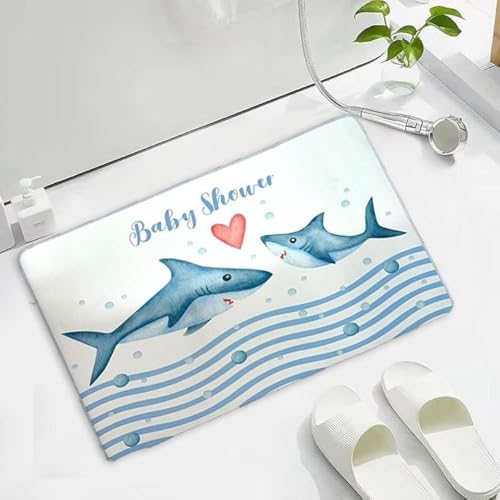 LESTER - دواسة حمام مستطيلة الشكل بتصميم سمكة قرش من ليستر، مقاس 50 × 80 سم، بلون أزرق وأبيض