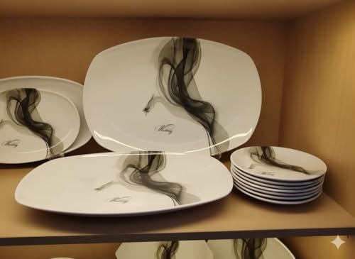 - تصميم فني أنيق: أطباق بيضاء مزينة بنقوش فنية رمادية داكنة أنيقة تضيف لمسة عصرية وراقية لطاولة الطعام