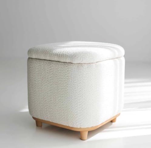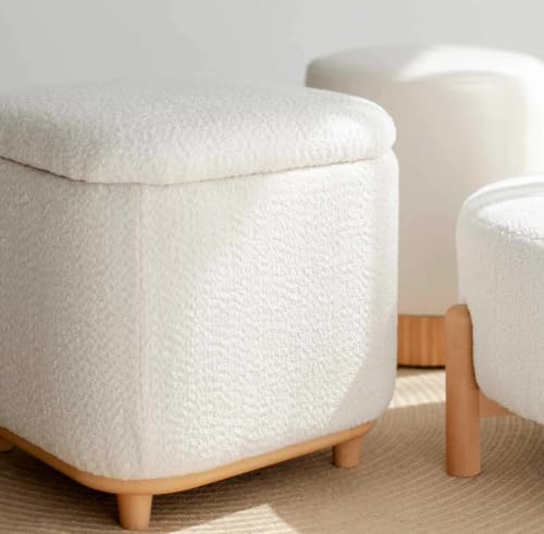 Generic - مسند قدم مربع عصري للتخزين بقاعدة خشبية صلبة، مسند قدم من قماش تيدي بلون ابيض، مقعد فانيتي لغرفة المعيشة، مقعد مريح