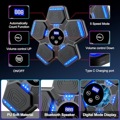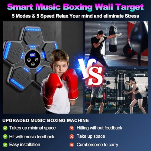 Swetfela - آلة ملاكمة موسيقية ذكية بتقنية بلوتوث مع قفازات وخمسة أوضاع للسرعة وعداد ومعدات تدريب ملاكمة مُثبتة على الحائط بإضاءة ليد، وشحن USB للأطفال والكبار لممارسة التمارين الرياضية