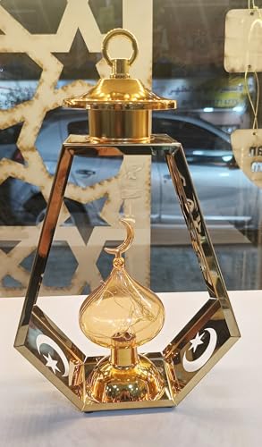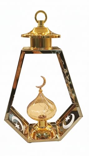 Generic - فانوس رمضان استانلس ستيل ذهبي مع زجاجة عطر، تصميم هرمي بزخارف القمر والنجوم، ديكور فاخر