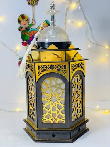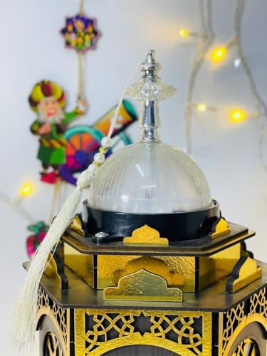 Generic - فانوس رمضان خشبي مع إضاءة وموسيقى، تصميم إسلامي تقليدي بزخارف هندسية، قبة شفافة، أسود وذهبي مقاس ٤٠ س