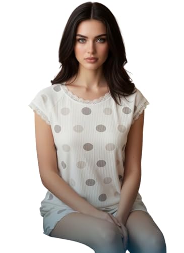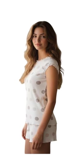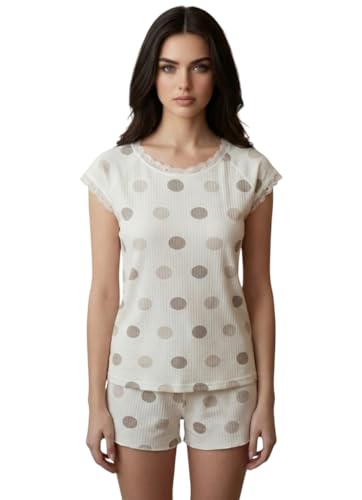 Generic - بيجامة صيفي هوت شورت قطن مضلع بتصميم منقط مطعم بدانتيلا للنساء