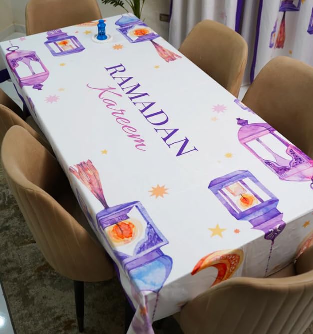 - تصميم احتفالي: يتميز بزخارف فانوس أرجواني مع نص "رمضان كريم"، مما يعكس جوًا أنيقًا واحتفاليًا مثاليًا لتجمعات الإفطار والمناسبات الخاصة طوال الشهر الكريم.