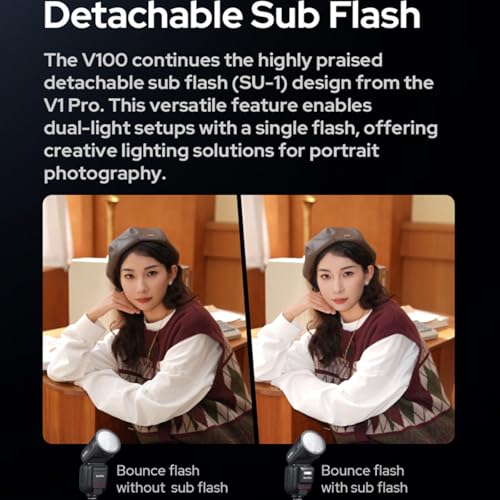 - [شاشة لمس بديهية وفلاش فرعي قابل للفصل] مجهزة بشاشة لمس ملونة كاملة 2.3 بوصة عالية الحساسية. يسمح للمصورين بضبط مستويات الطاقة بسرعة، وتنشيط المزامنة عالية السرعة، والتبديل بين أوضاع TTL/M، وإقران الأجهزة بنقرة واحدة. يستمر V100 في تصميم الفلاش الفرعي القابل للفصل (SU-1) من V1 برو.