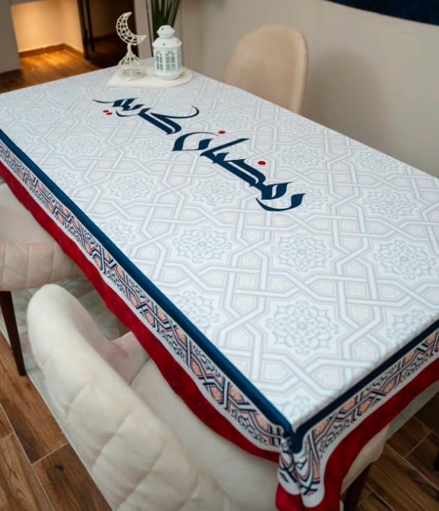 Generic - مفرش طاولة مخملي ناعم مع خط عربي، تصميم نمط هندسي، حواف باللونين الاحمر والكحلي، متوفر بمقاسات متعددة، 90 × 90 الى 140 × 280 سم (140 × 280)