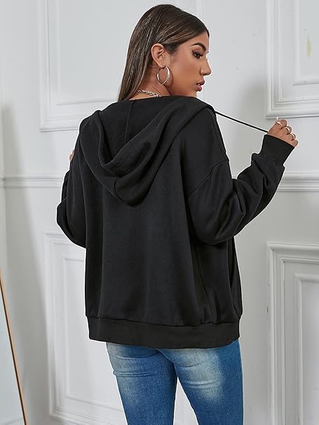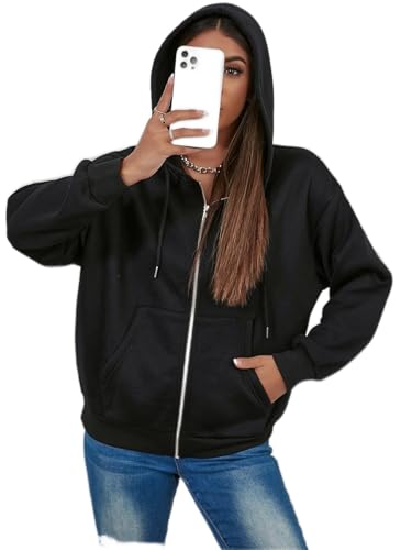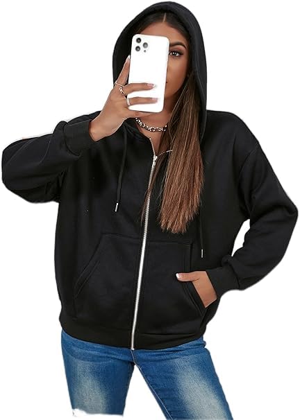 Generic - سويت شيرت نسائي بسحاب كامل، أسود، بغطاء رأس وجيوب جانبية - مقاس فرى سايز - خامه ملتون بلوش بوبرة داخليه- موديل رقم#: 591B