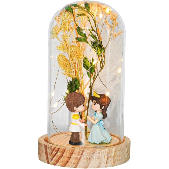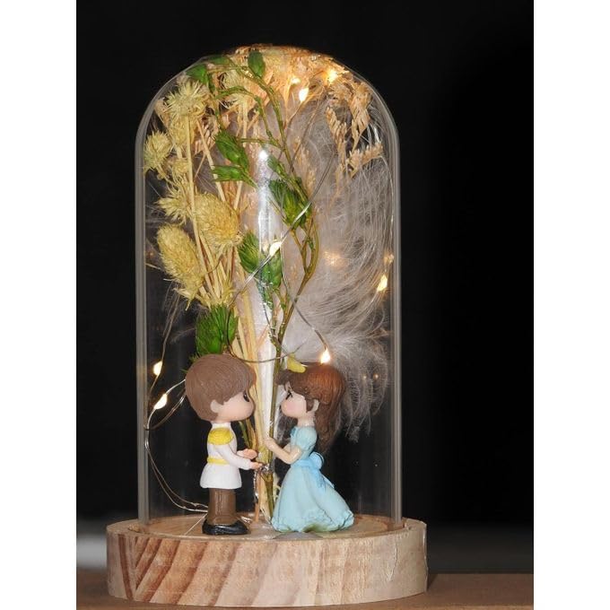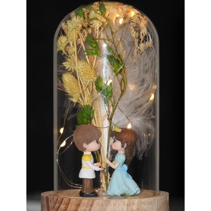 Generic - وردة في قبة ورد ونبات وريش انيق ، باضاءة ليد داخل قبة زجاجية بقاعدة خشب مجرة الورد الملك والأميرة