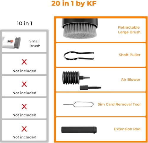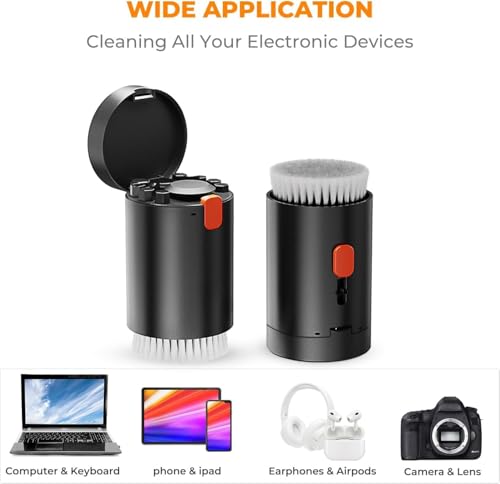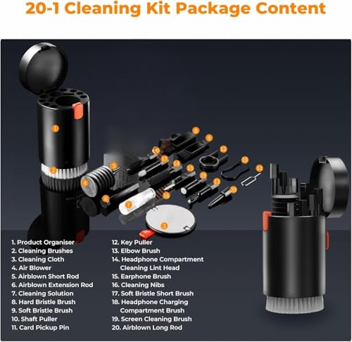 - Multi-purpose Cleaning Kit: Electronic cleaning kit includes cleaning pen with metal tip, sponge brush, mini soft brush, round brush, keyboard brush, keycap puller, switch puller, spray bottle, fiber fleece swipe, air blower with long and short nozzles, lens cleaning pen with soft pad, hard bristled brush and soft-bristled brush, and a card remover. The cleaner kit can efficiently clean laptops, keyboards, headphones, screens, phones, etc.
