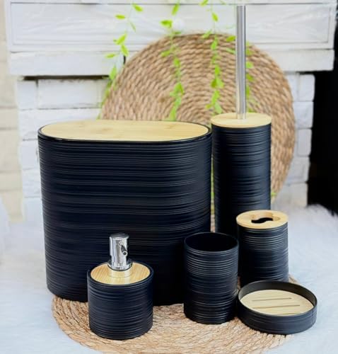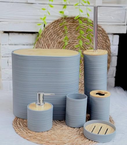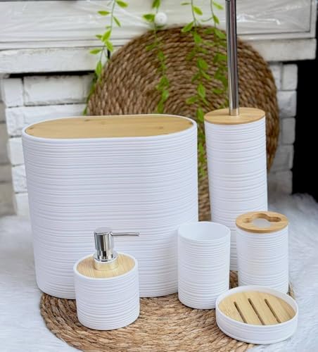 Generic - 6 Piece Bathroom Accessories Set with Bamboo Lids, Striped Design, Includes Tissue Box, Toilet Brush Holder, Soap Dispenser, Cup, Soap Dish