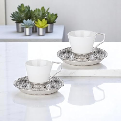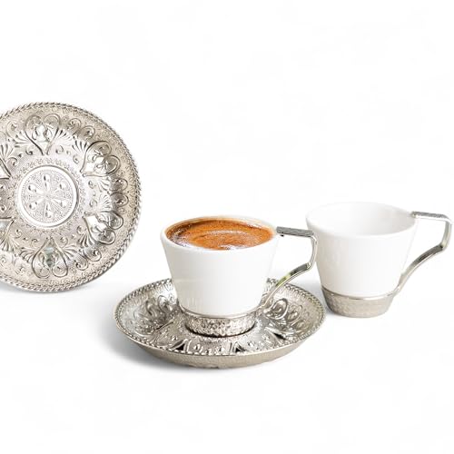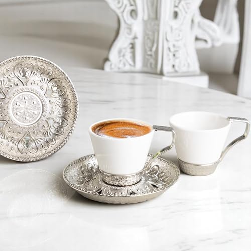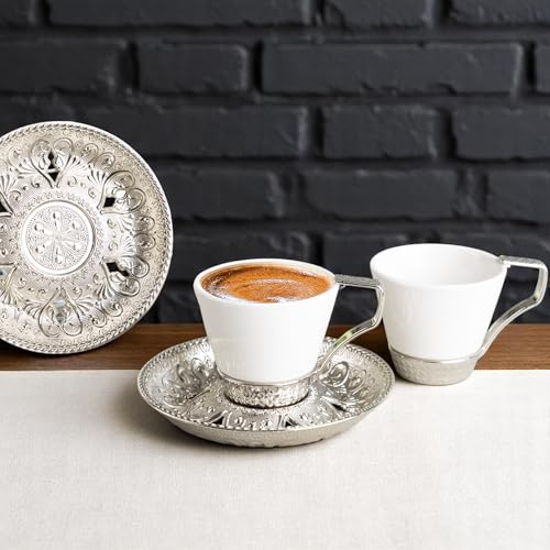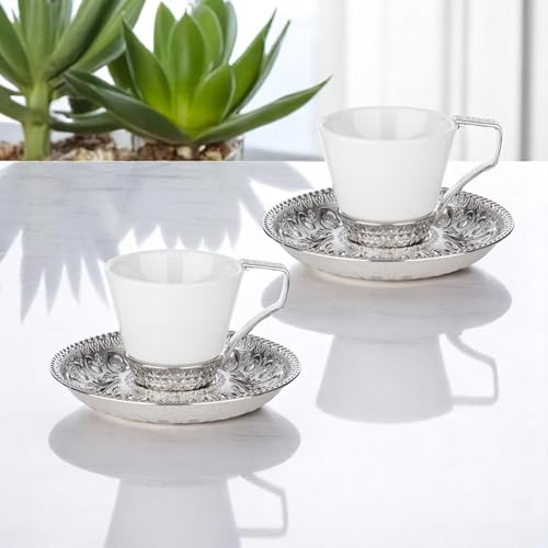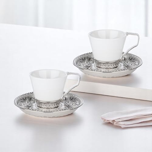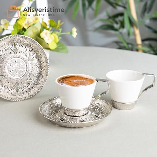 Alisveristime - Alisveristime (Set of 2 Turkish Coffee Set with Porcelain Cups, Zamac Holders & Saucers – Selcuklu Ottoman Design, 80ml Capacity (Silver)