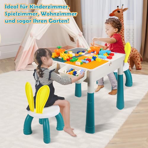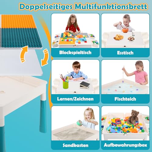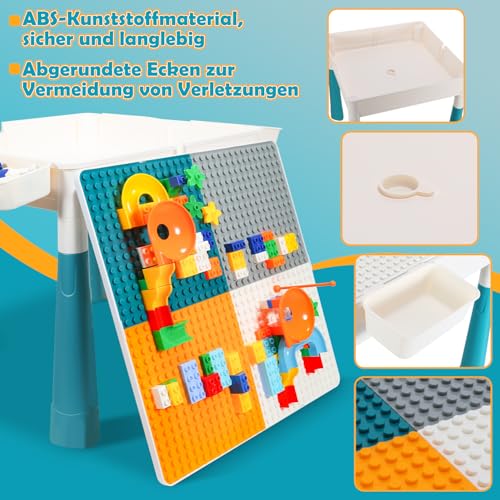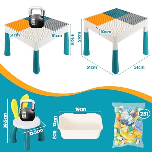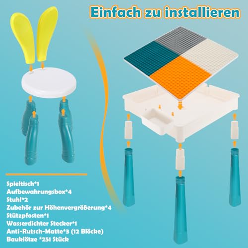 - Children's table with chairs set: our children's table chair set offers everything your little explorers need: a multifunctional activity table top, 251 blocks, 4 practical storage boxes, 12 non-slip pads, 2 chairs, 4 height adjustment sets, 1 support post and 1 waterproof cap. Thanks to the screwless design, assembly is a piece of cake, and cleaning is done in no time with a damp cloth.