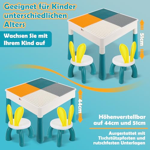Ansobea - Children's Table with 2 Chairs, Play Table Children with 251 Building Blocks, Multifunctional Activity Table from 2 Years with Storage Space, Creative Building Block Gaming Table Building