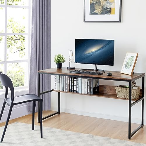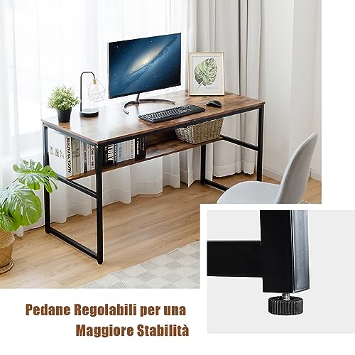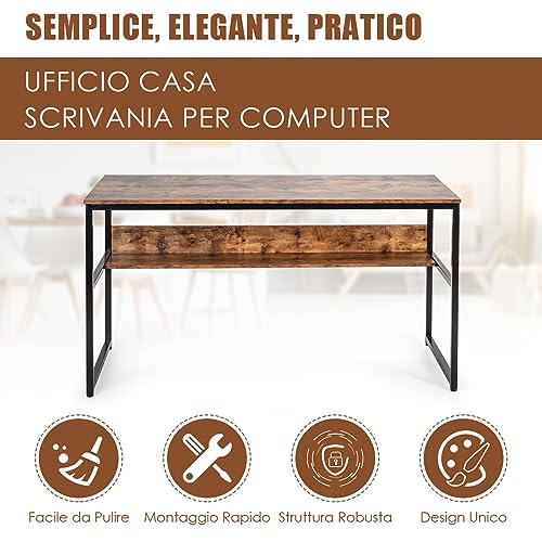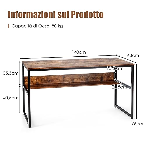 COSTWAY - COSTWAY Computer Desk with Sturdy Metal Frame, Computer Desk with Storage Shelf, Large Top and Adjustable Feet, Ideal for Home and Office, 140 x 60 x 76 cm (Hazelnut)