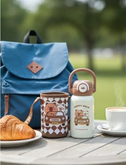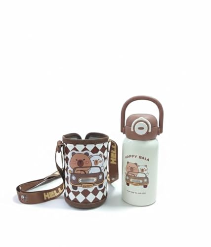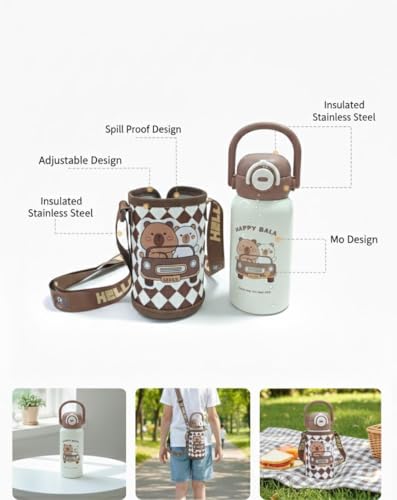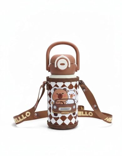 Spaceshoop - زجاجة مياه لطيفة معزولة من الستانلس ستيل للاطفال مع حافظة حمل واقية وحزام كتف قابل للتعديل - قارورة حرارية ساخنة وباردة للمدرسة والسفر - 500 مل (1، بني وكريمي)