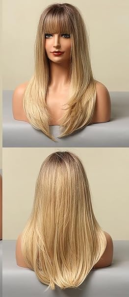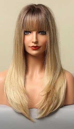ECIF - Blonde Wigs for Women Long Straight Wigs with Bangs Heat Resistant Fiber Synthetic Wigs Natural Looking