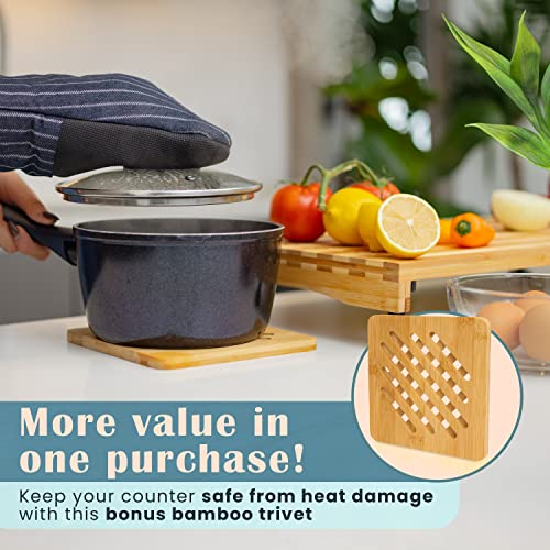 - Comes complete with a handy bamboo trivet which aids you in keeping your counter and table tops protected from unwanted damage