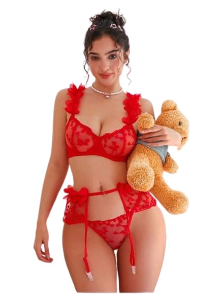 هنادي - بكيني قطعتين بخامة الدانتيل الكوري الفاخر مع ليكرا عالية الجودة - باللون الاحمر الجذاب، موديل HN 6034 لاطلالة انثوية حرة، مقاس واحد