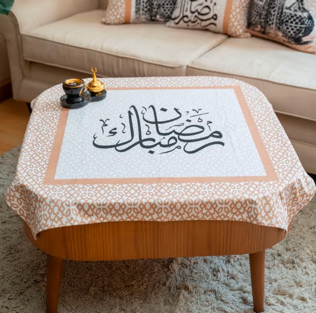 Generic - Islamic Calligraphy Tablecloth, White with Peach Border, Velvety Soft Fabric, Multiple Sizes Available, Mubarak Design (90 * 90)