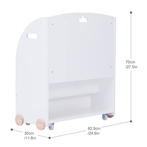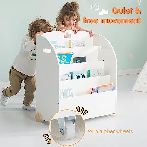 - 【HIDDEN SPACE & CASTERS】- The bookshelf is trapezoidal, with four different height compartments in front, suitable for storing different sizes of books; back is a hidden storage space, it is a very good design for placing books or toys that are not commonly used. Four casters help children to adjust directions easily. Together with the handle design, children can walk around the playroom with their favorite books.