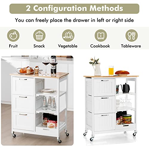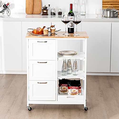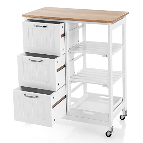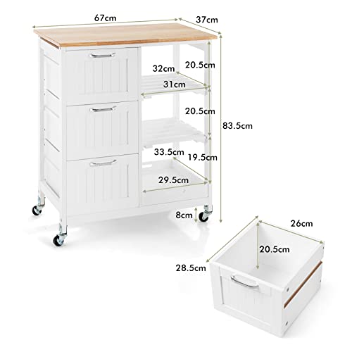KOMFOTTEU - KOMFOTTEU Kitchen Trolley, Four Tier Kitchen Cabinet with Worktop, 3 Drawers and Storage Shelf, Serving Trolley for Kitchen and Dining Room, 67 x 37 x 84 cm (White)