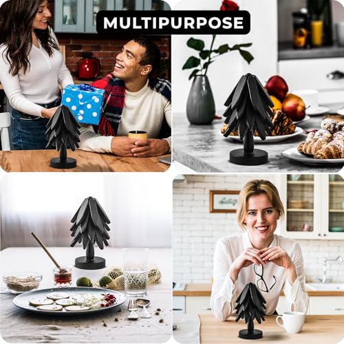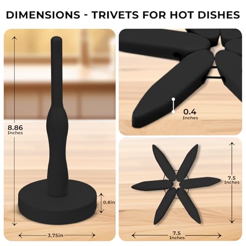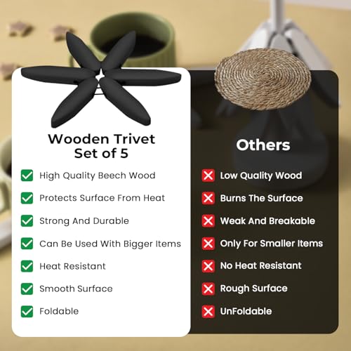 MERN - MERN Wooden Trivets for Hot Dishes, Hot Pots and Pans - Decorative Tree-Shaped 4 Foldable Beech Wood Mats + 1 Stand for Kitchen Countertops - Heat-Resistant Trivet Set - Black Kitchen Decor