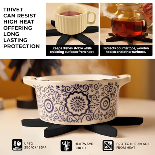 - 𝐄𝐥𝐞𝐠𝐚𝐧𝐭 𝟓-𝐏𝐢𝐞𝐜𝐞 𝐒𝐞𝐭 𝐟𝐨𝐫 𝐃𝐚𝐢𝐥𝐲 𝐔𝐬𝐞 & 𝐃𝐢𝐬𝐩𝐥𝐚𝐲: Our trivets for hot dishes Includes 4 decorative coasters and a coordinating stand that elevates your table setting. Ideal for hosting guests or enhancing your everyday kitchen presentation.
