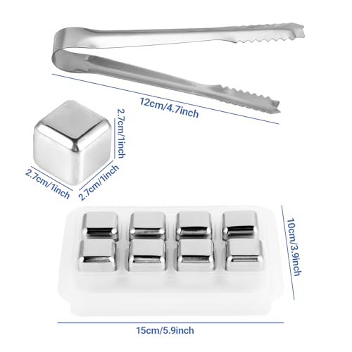 KITDAHOM - Pack of 8 Stainless Steel Ice Cubes, Reusable, 304 Stainless Steel Whisky Stones with Tongs, Perfect for Cocktails, Wine and More