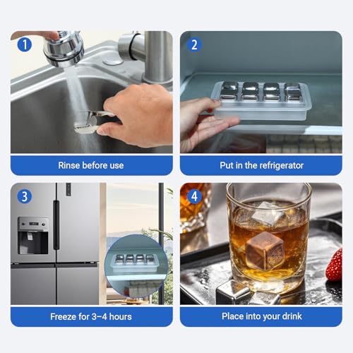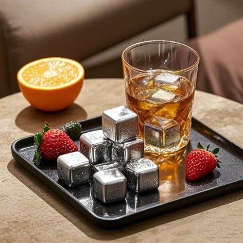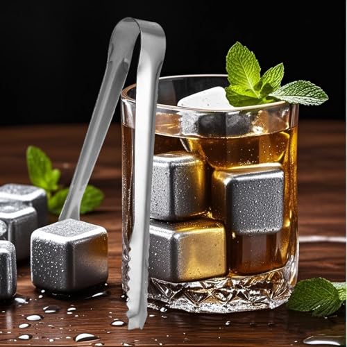 - High-quality ice cubes stainless steel - 304 stainless steel: This set contains 8 reusable ice cubes made of food-safe 304 stainless steel, non-slip tongs and an elegant gift box. The precision polished surface is smooth, rust-proof and corrosion resistant. DISHWASHER SAFE & EASY TO CLEAN - The perfect choice for bars, family gatherings and everyday enjoyment.