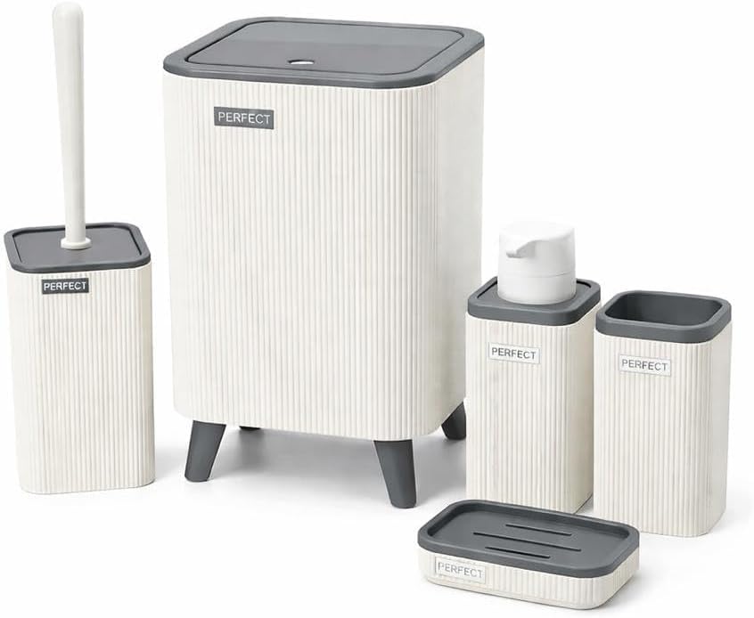 - مجموعة كاملة: مجموعة الحمام المكونة من 5 قطع تتضمن موزع صابون وبطانة وسلة مهملات وفرشاة مرحاض مع حامل وحامل فرشاة أسنان