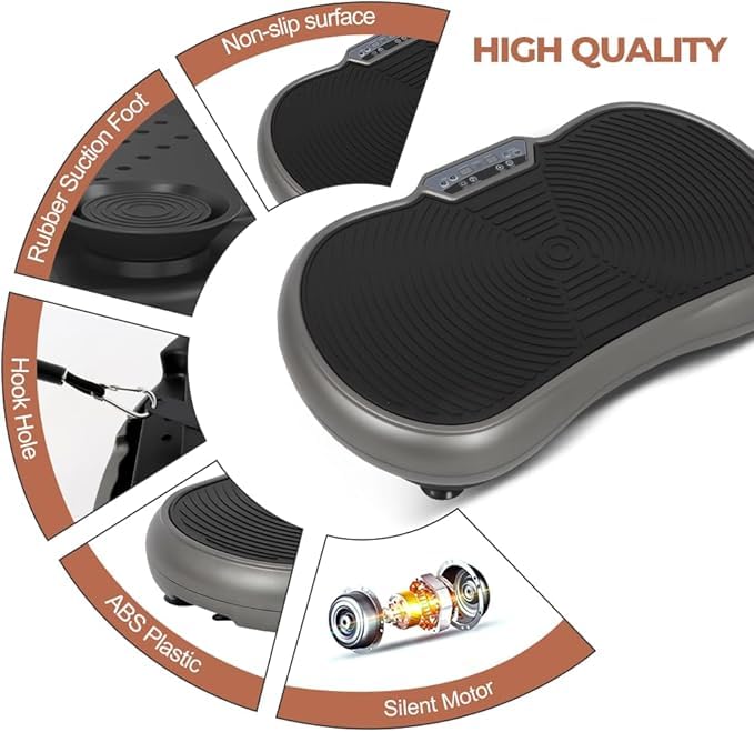 - High Quality Vibration Trainer --- The waver vibration plate made of fine ABS, lightweight but strong. Non-slip surface soft and keep body on it unmove. Non-slip suction feet will not scratch your floor and guarantee the machine stability. Most important is the silient motor, no body will be disturbed when using it at home.