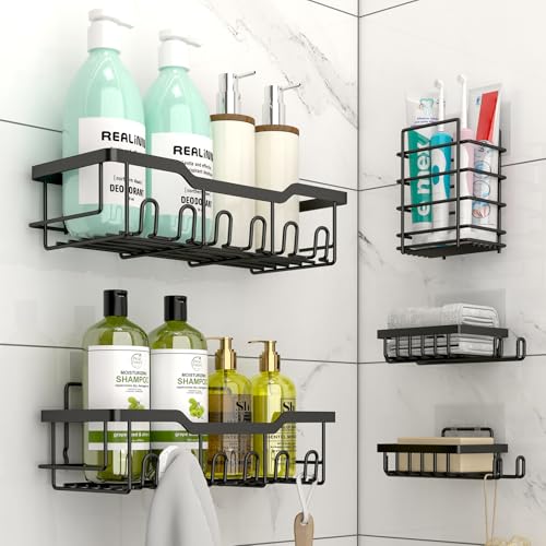 REALINN - REALINN Shower Caddy, [5-Pack] Shower Shelves for Inside Shower, Adhesive Shower Organizer, No Drilling Rustproof Stainless Steel Bathroom Caddy, Large Capacity Shower Rack, Black