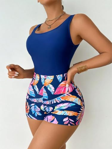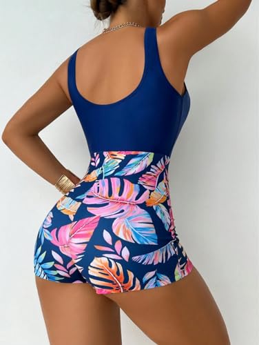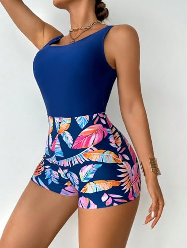 Generic - SHEIN Swimsuit Women’s Tropical Print One-Piece Swimwear- Low Back Criss Cross Swimsuit with Boxer Shorts Bottom, Beachwear for Vacation, High Stretch One Piece