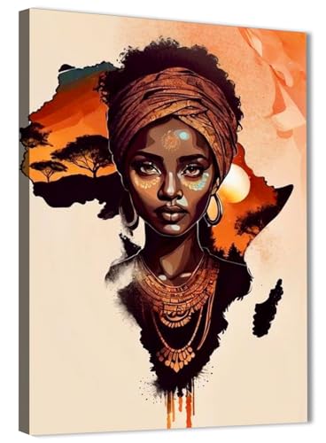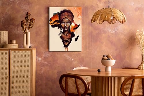Skills - لوحات فنية جدارية تصور امرأة ذات بشرة سمراء داكنة أمام خلفية مجردة لخريطة أفريقيا - تعلق على الحائط لتزيين غرفة المعيشة وغرفة النوم وديكورات المكتب وغيرها - مقاس (30 سم × 40 سم ) من سكيلز