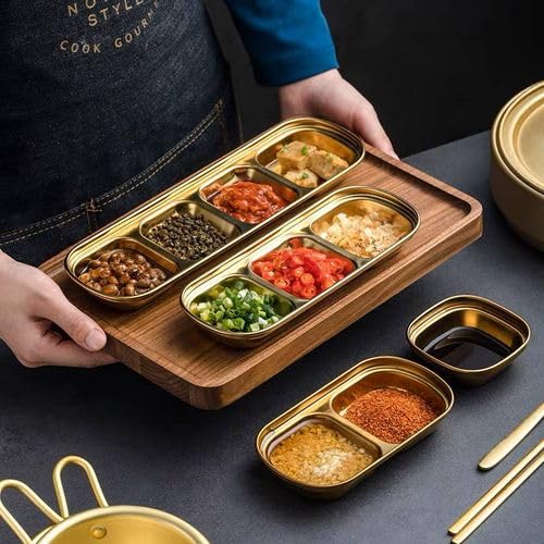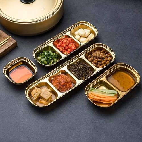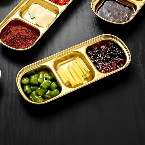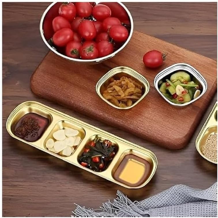 - LUXURIOUS DESIGN: Made of durable stainless steel four-section sauce plates with an elegant gold finish, these sauce plates are perfect for serving spices and sauces.