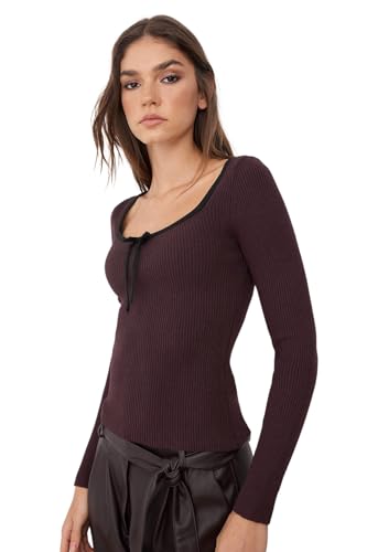 Trendyol - ترنديول سويتر صوف فاخر بمظهر مرسيريزد بلون بورغندي / شريط غزل خاص / مزين بفيونكة Twoaw25Kz00207، احمر كلاريت مقاس M